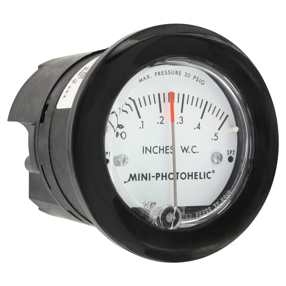 MP系列 Mini-Photohelic? 微差压开关/表将可靠耐用的Minihelic? II为差压表和和两个单刀双掷的设定开关结合起来,用于监测和控制气体的正压,负压或差压,微差压表的读数和开关的动作是分别独立的。 前面板和背板上都带有开关的状态LED指示灯,开关的设定点值可通过背板上的按键来调整。这个小尺寸的微差压开关/表最适用于通风柜,洁净室,以及除尘,气力输送等应用场合。
